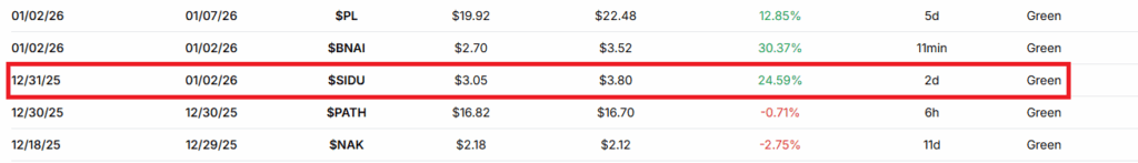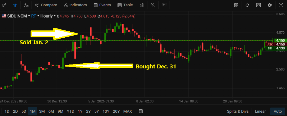 When I saw the setup I liked, I entered on December 31, then held SIDU a couple days and sold into strength on January 2, with a nearly 26% gain: